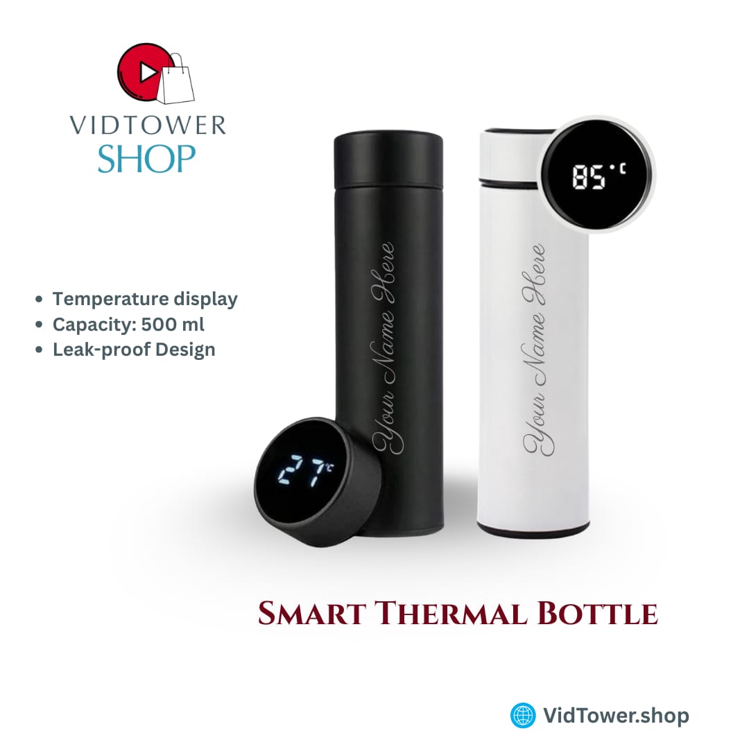 A sleek and advanced smart thermal bottle featuring a temperature display, leak-proof design, and 500ml capacity. Personalizable option available to add your name, making it an excellent choice for everyday use.